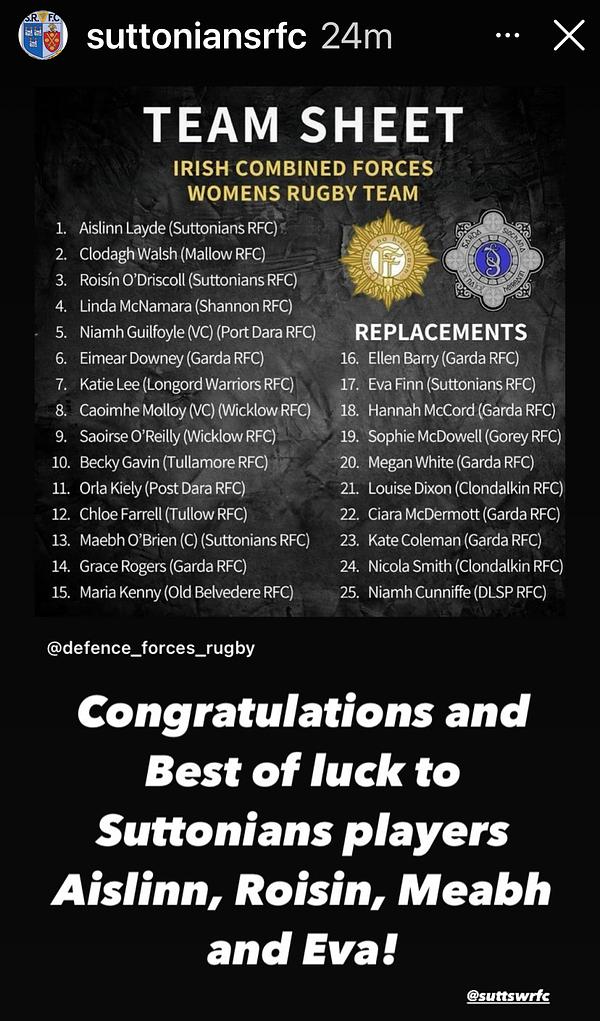 See MoreCONGRATULATIONS TO AISLINN LAYDE, ROISÍN O'DRISCOLL, EVA FINN AND CAPTAIN TOMORROW MEABH O'BRIEN. GOOD LUCK FOR THE GAME,KO IS AT 14.30PM IN MALAHIDE RFC V THE FRENCH MILITARY TEAM!